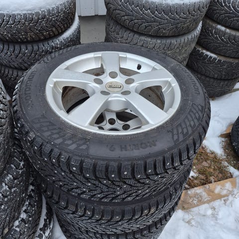 Mb alkuperäiset 16" alumiinivanteet, uuden karheilla Kumhon 205/55/16 nastarenkailla.