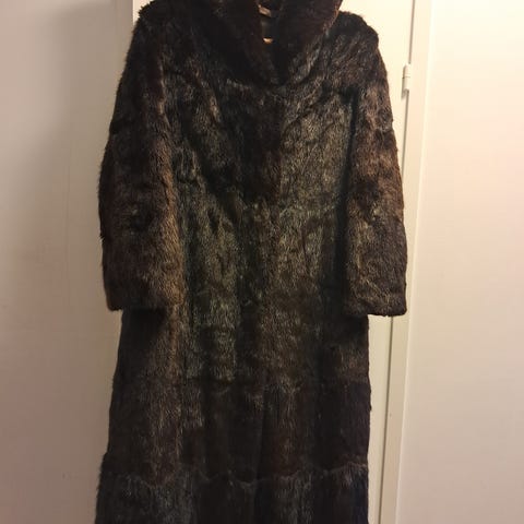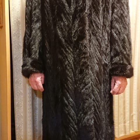 Pituus 88cm. Kai- kai 60. Turkin väri musta krimi, hiat ja kaulus tumman ruskea minkki.