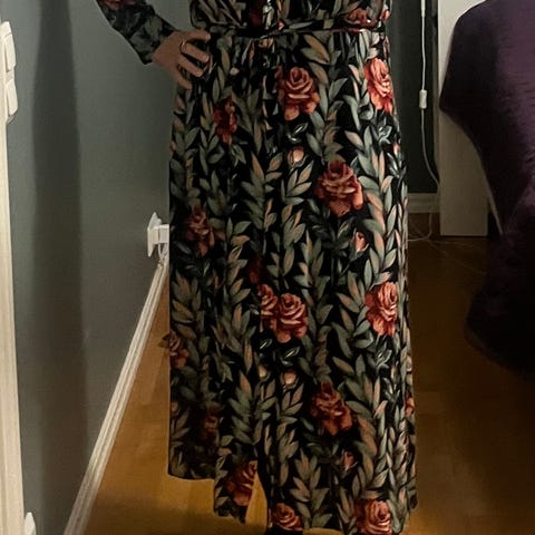 Mustalla pohjalla kuvioita. Sivusaumoissa taskut. Kunto uudenveroinen. Kai-kai 50cm, pituus 143cm