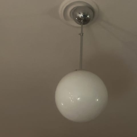 Riippuvalaisin, jossa valkoinen lasikupu. Valaisin on suunniteltu riippuvaksi katosta ja sen materiaaleina ovat lasi.