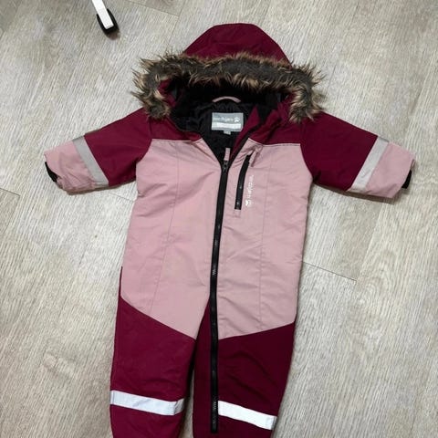 Toppahaalari koko 86. Jalkaremmit ehjät. Kauluksen kohdalta toinen tarra irronnut, katso kuvat.