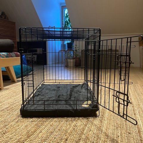 Metallinen koiran häkki kahdella ovella ja muovipohjalla. Pohja irrotettava. Siistissä, käytetyssä kunnossa, mukana voi tulla hippasen villakoiria ja koirankarvoja. Parempi pesu jää ostajalle.