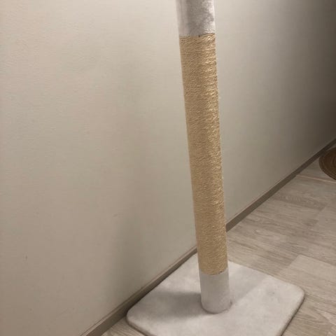 Raapimistolppa joka on verhoiltu kestävällä sisalköydellä, tolpan päästä roikkuu pallo leikkimiseen. Kuin uusi, ei ole ollut juurikaan käytössä.