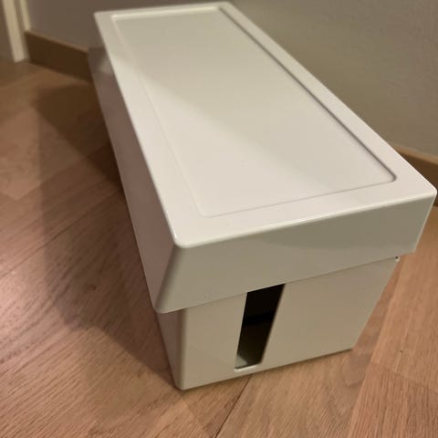 Jonkin verran käytetty, ok kunnossa oleva IKEA Romma johtojen säilytys/piilotuslokerikko. Valkoinen, jossa pari naarmua.