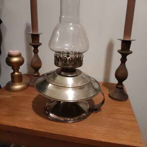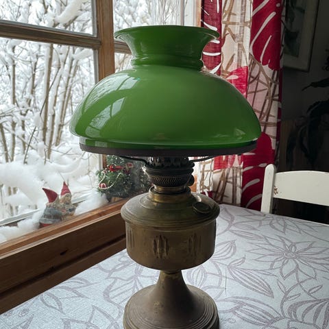 Todella kaunis vintege öljylmppu, valkoisella kuvulla. Todella hyvässä kunnossa. Kuvut ja lasi alkuperäiset sekä täysin ehjät.