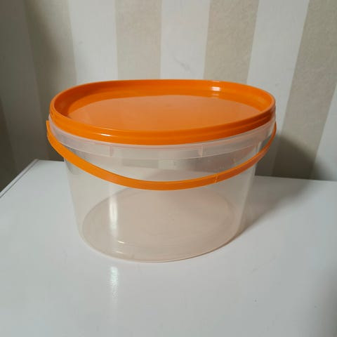 Myydään tarpeettomana varmaan kerran käytössä ollut säilytysrasia. Tiivis kansi. Tilavuus noin 2,5L. Mitat korkeus n.13cm, pituus n.22cm, leveys n. 14cm. Pohjassa lainekuviointi.