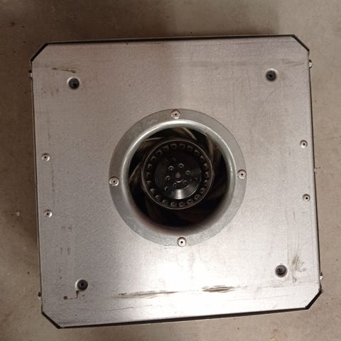 ebmpapst A6E360-AA08-43 teollisuuspuhallin, halkaisija noin 40 cm, musta metallirunkoinen. Purettu testilaitteesta, missä sitä on käytetty ehkä pari tuntia.