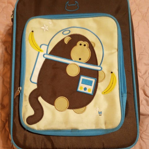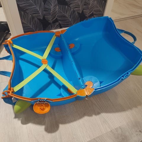 Lasten matkalaukku sinisenä, jossa valkoinen lentokonekuvio. Kova kuori, vetokahva ja pyörät helpottavat kuljetusta. Sisätilat soveltuvat pienten tavaroiden säilytykseen, kuten lelujen kuljettamiseen.