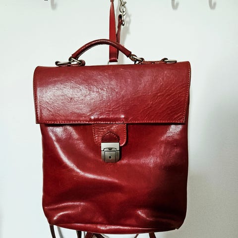 Musta reppu aitoa laadukasta nahkaa. Reppu on ostettu Vintedistä. En ottanut sitä omaan käyttöön, koska siinä on melko voimakas hajusteen tuoksu. Tämä on huomioitu hinnassa. Simppeli malli. Sisällä ei ole vuorta eikä pienempiä taskuja.
