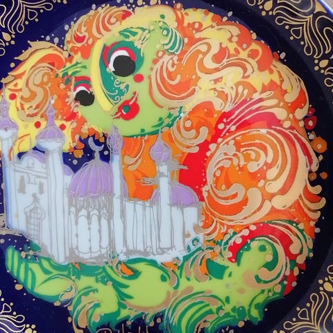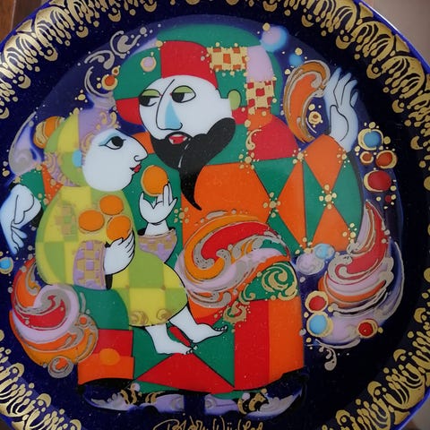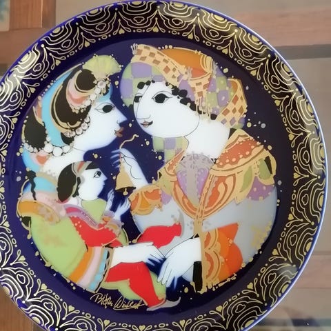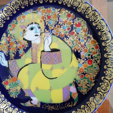 Tanskalainen taiteilija ja muotoilija, Björn Wiinblad, joka tunnetaan erityisesti koristeellisista, satumaisista hahmoistaan ja yhteistyöstään Rosenthalin kanssa. Lautasen pohjassa näkyvä signeeraus on hänen. Taulun nimi on 'Sindbad der Seefahrer'.