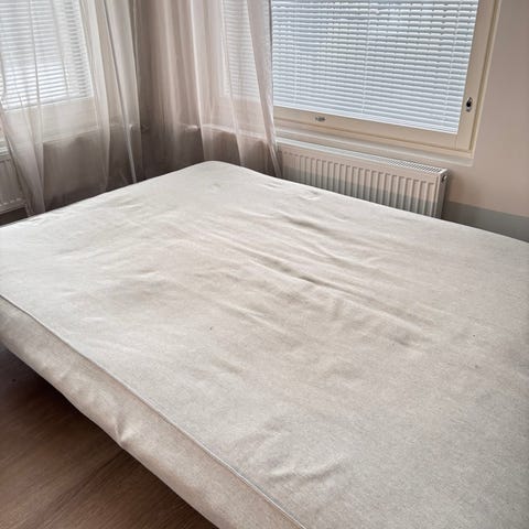 Futon vuodesohva ja rahi. Helppokäyttöinen mekanismi, kangas ei priima enää, varsinkin rahissa jälkiä, mutta meillä pidetty siinä vilttiä. Ajaa asiansa vielä. Koirakoti Lempäälässä.
