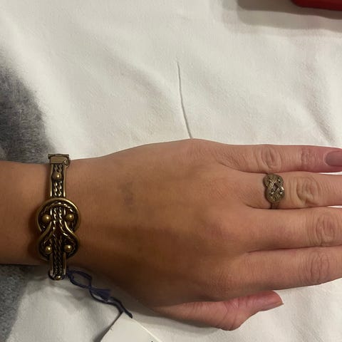 Kalevala Tervas nahkaranneke, jossa hopeinen koriste. Jäänyt lähes käyttämättömäksi. Pituus 23,5cm ja leveys 3cm.