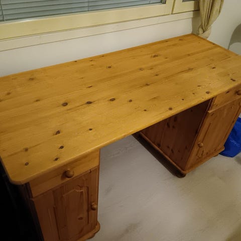 Sähköisesti säädettävä työpöytä, jossa on puukuvioitu kansi. Pöydässä on metallirunko ja sähköinen korkeussäätömekanismi, jota ohjataan painikkeilla. Pöytä soveltuu työskentelyyn eri korkeuksilla ja tarjoaa ergonomisen ratkaisun työtilaan. Pöydässä on jonkin verran maalia ja epoksitahroja, ne voidaan hioa pois. Tämä on otettu huomioon hinnassa.