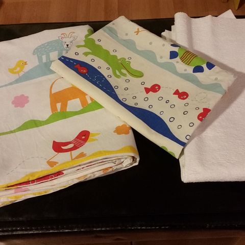 Täkki 150x100, siihen neljä pussilakanaa, tyyny 45x28, siihen neljä tyynyn liinaa. Tyynyn liinat erikokoisia, joihinkin mahtuisi kaksikin tämän kokoista tyynyä.