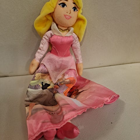 Disney Prinsessa pehmolelu, jossa pitkät vaaleat hiukset ja vaaleanpunainen mekko, pehmeä materiaali.