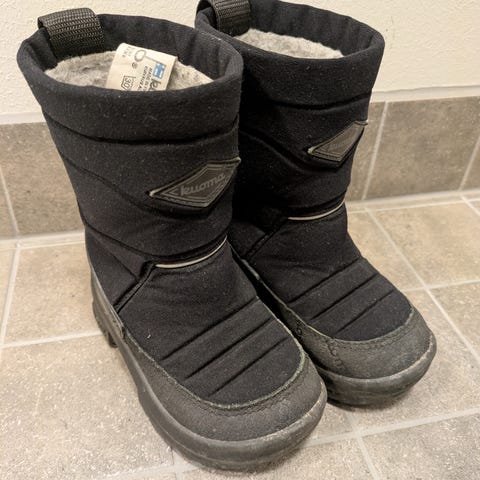 Hyväkuntoiset kuomat, kahdella käytetty, meillä ei kerennyt olla käytössä kuin alkutalven. Kantapäissä sisävuoressa tyypillistä kulumaa. Tässä mallissa on sivuilla tarrat, mitkä helpottaa pukemista.