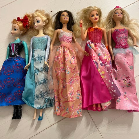 Leikityt siistit Barbiet, mukana päällä olevat vaatteet. Ehjät kädet ja jalat. Yhdessä mekossa pieni purkauma. Merenneidon pyrstö muuttuu mekoksi kaulan nappia painamalla. Lähitarkastelussa pientä käytön jälkeä. Hinta koko setille.