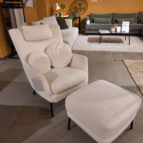 Myymälässä mallina ollut tuoli ja rahi. Kuvissa olevat tyynyt kuuluvat myös kokonaisuuteen. Kangas on kestävä huonekalukangas Poppy Off White.