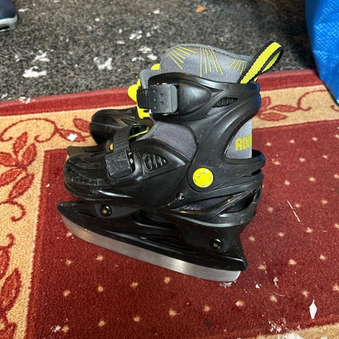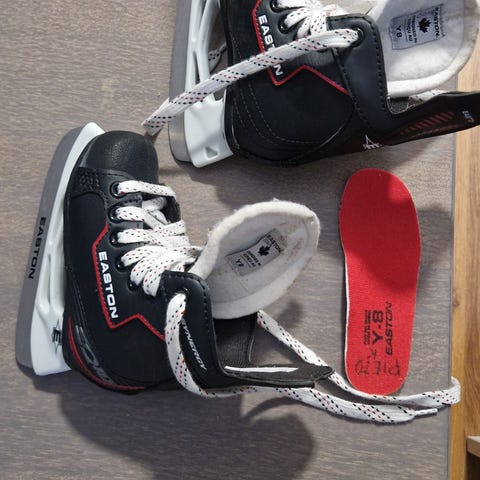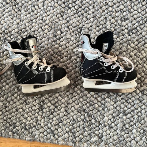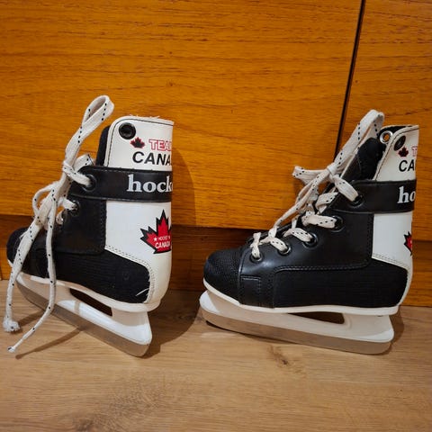 Lasten jääkiekkoluistimet koko 25 mustavalkoinen väri. Hyvässä kunnossa ja terässä. Pohjallisen mitta 16cm.