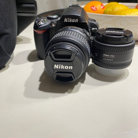 Nikon D40 digijärjestelmäkamera kittiobjektiivilla AF-S DX 18–55mm f/3.5–5.6G II. Kevyt ja helppokäyttöinen järjestelmäkamera, sopii hyvin aloittelijalle, harrastajalle tai varakameraksi.