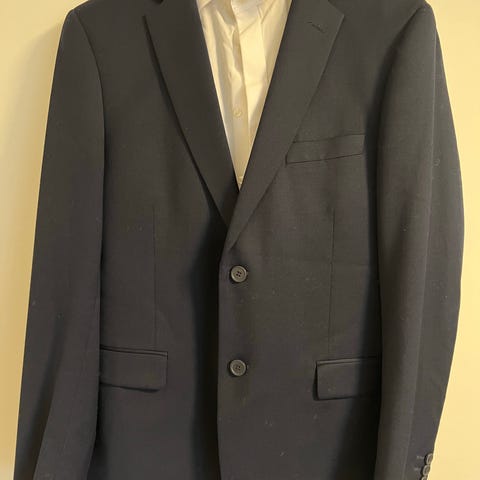 Dressmann miesten puku, koko 52, sininen väri, valmistettu polyesteristä. Puku koostuu takista ja housuista.