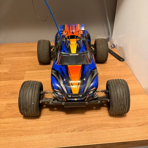 Hulna radioohjattava kaivuri metallikauhalla. Mukana lisäksi latausyksikkö
