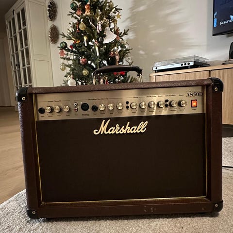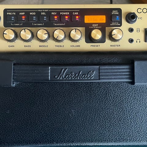 Hyväkuntoinen Marshall MG100FX -kitaravahvistin. Kaksi 12 tuuman kaiutinelementtiä ja laaja efektivalikoima (reverb, chorus, phaser, flanger, delay).
