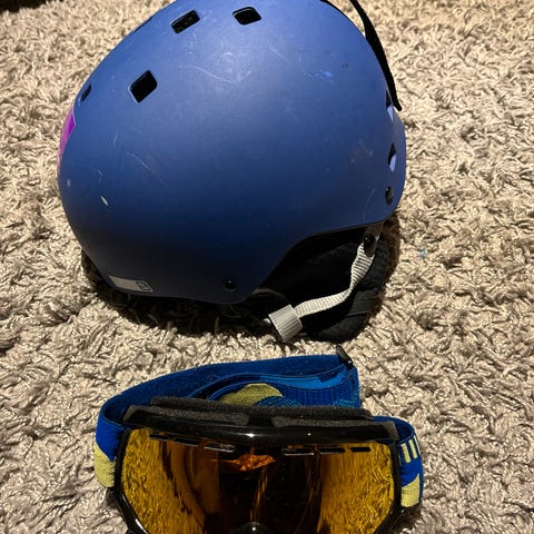 Salomon kypärä sininen väriltään, sisältää kiinnitetyt lakettelulasit. Kypärässä on pehmustettu sisäosa ja säädettävä hihna mukavuuden ja istuvuuden parantamiseksi.