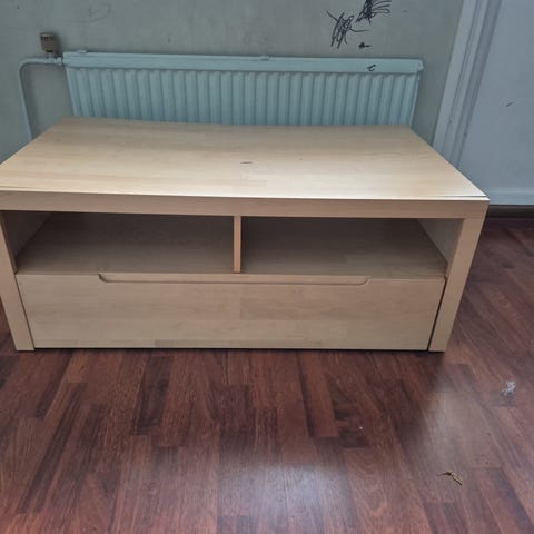 Hyväkuntoinen tv taso uuden tieltä pois. Pohjapalkin ruuvi kadonnut, laitettu naulalla kiinni.