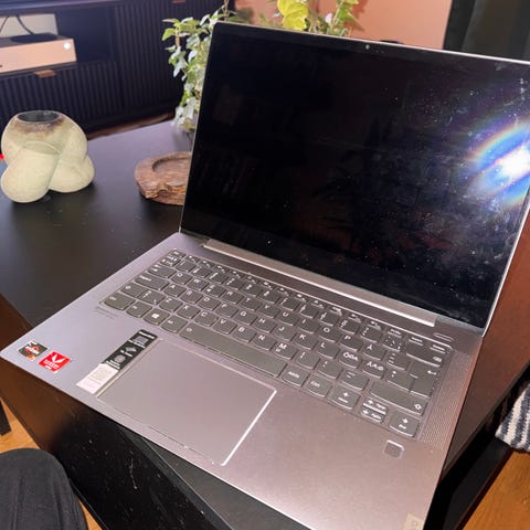 Lenovo Yoga kannettava tietokone harmaassa värissä. Laite sisältää näppäimistön ja kosketuslevyn.