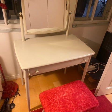 Kampauspöytä, jossa on ovaali peili ja koristeellinen puukehys. Peili on kiinnitetty pöytään, jossa on yksityiskohtaiset veistokset ja kaksi vetolaatikkoa. Pöytä on valmistettu puusta ja siinä on neljä koristeltua jalkaa. Sopii esimerkiksi meikki- tai työpöydäksi.