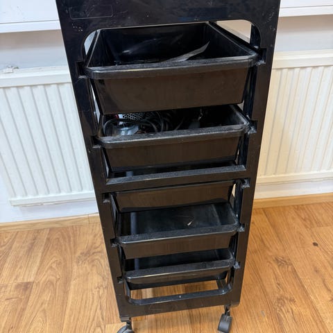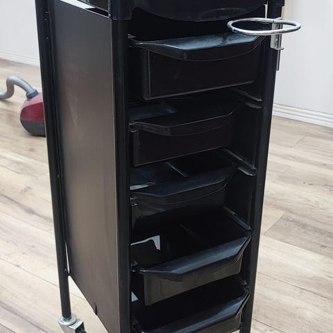 Mustapintainen pyörällinen kampaamo kärry neljällä laatikolla