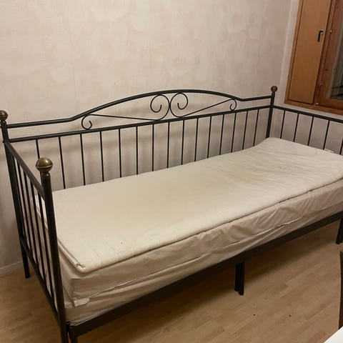 Sofie (Asko) rautasänky levitettävä. Tyynyt ja päiväpeite ei kuulu kauppaan. Patjan päällinen rispaantunut. Käyttötarkoituksesta riippuen patjan voi joutua uusimaan.