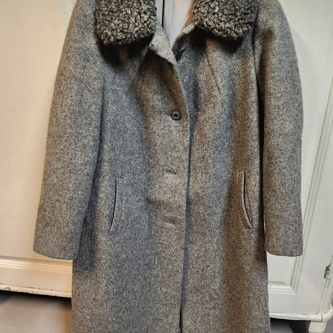 Suomalaisen Milgo Ladyn vintage villakangastakki harmaana. Kokolapussa lukee 38, mutta on malliltaan hieman väljä.