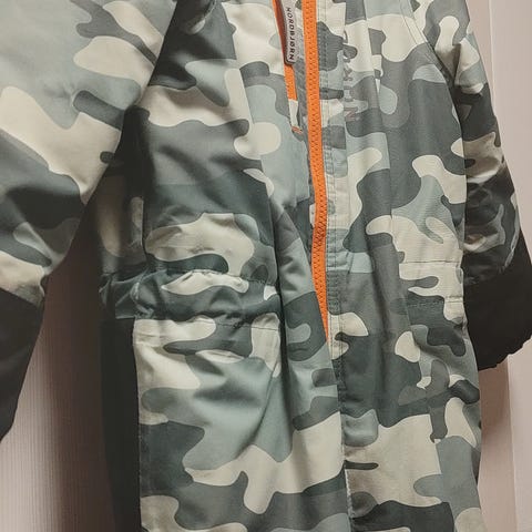 Yhden tytön käyttämä lämmin talvihaalari huippuominaisuuksilla. Kunnosta en löydä muuta moitittavaa, kuin ripustusrenksu on irronnut ja hihan alaosassa hieman kulumaan, kts. kuva. Polvissa pientä pehmentymää.
