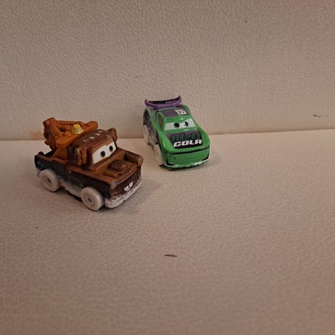 Disney Pixar Cars -elokuvien hahmojen leluautot, yksi vihreä maastoauto ja yksi sininen urheiluauto. Pienikokoiset ja muovista valmistetut lelut.