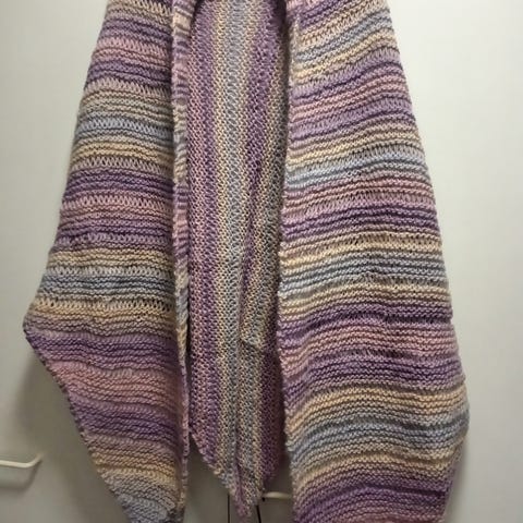 Itse tehty kolmiohuivi, lankana Novita Nalle. Käyttämätön. Leveys n. 180 cm, korkeus n. 65 cm.