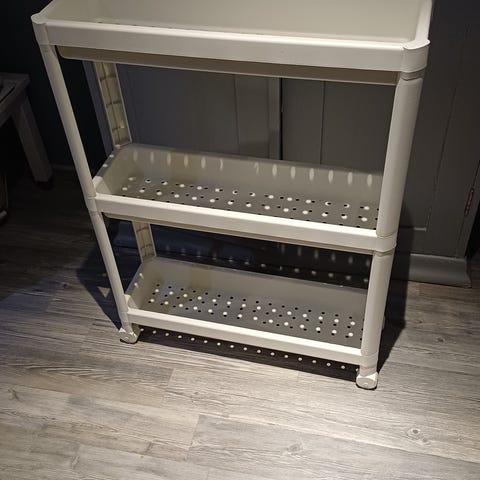 Ikea vesken rullakko. Huom. vain kaksi hyllyä, yksi poistettu.