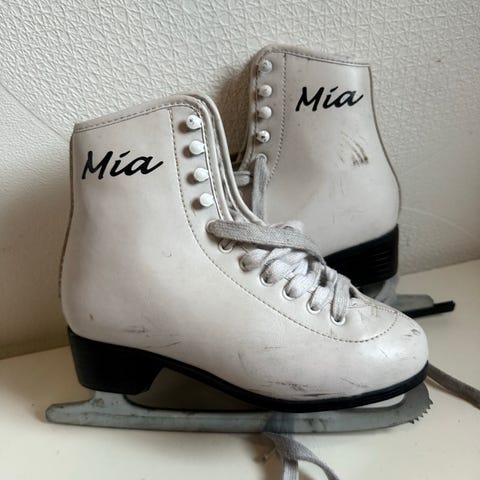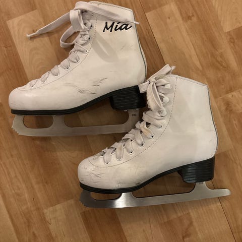 Käytetyt, mutta siistit lasten luistimet. Lämpöinen karvavuori. Koko 33. Yksi isompi kuluma luistimen kärjessä, siitä kuva. Aika varmasti viime talvena teroitettu.