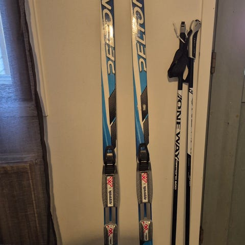Sukset 120cm, monot noin kokoa 33, sauvat 100cm. Hyvä käytetty kunto. Monoissa pohjallisen sisämitta 23cm.