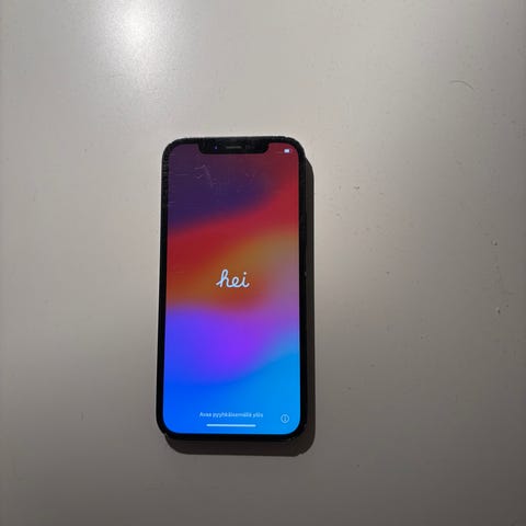 Valkoinen IPhone 12 mini jossa näyttö ja haptic rikki. Standardi 1.0x kamera menee suttuiseksi välillä mutta 0.5x kamera toimii ongelmitta. Takalasi ja runko ovat kuitenkin hyvässä kunnossa.