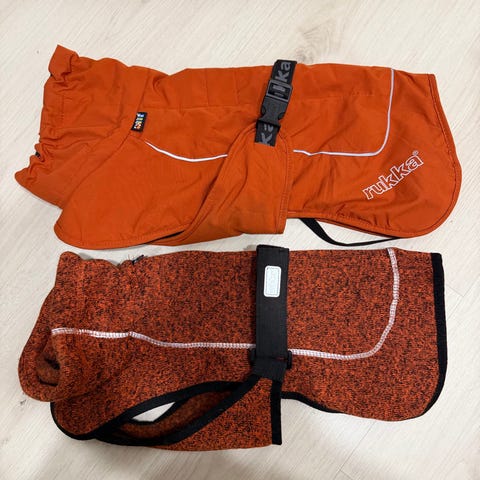 Ihana neule on liian pitkä meille, kahtena päivänä juuri ollut päällä sohvalla köllöttäessä kun odoteltiin pönttöuunin lämpeämistä.. pysyy päällä paremmin kuin peitto 😉 tosi kutiava koira joka tämän hyväksynyt eli ei pakkomyynnissä.. sopii esim tanskandogille.. Tarjota saa..