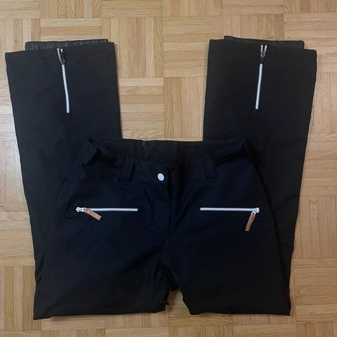 Vähällä käytöllä olleet siistit ja ehjät mustat lasketteluhousut. Koko XS. Sisäreisissä ilmanvaihto vetoketjuilla ja mesh-kankaalla. Lahkeiden suissa lumilukot.