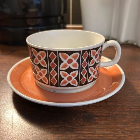 Geflen Maud kukkakuvioinen kahvikuppi lautasella. Ruotsalaisessa kupissa on sisäpuolella raitakuvio