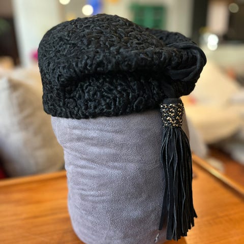 Musta vintage krimi tai karakau turkishattu, jota voi käyttää pyöreänä tai suikkamaisesti