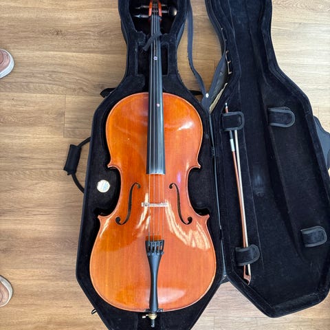 Mukana pehmeä kotelo, sello, jousi, ja hartsi.