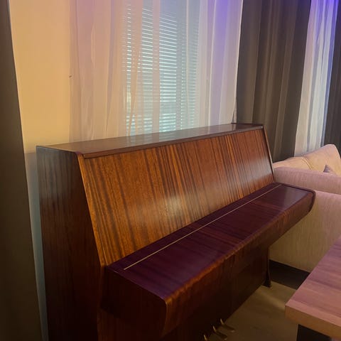 Upright-piano vaaleaa puuta. Sisältää koskettimet ja jousimekanismin. Soveltuu sisätiloihin soittimena tai sisustuselementtinä.