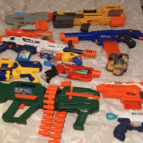 10 kappaletta Nerf pyssyjä. Ammuksia vain muutama tyydyttävä jäljellä.