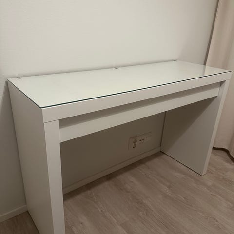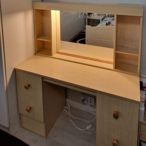 Myydään valkoinen, ehdostusta vaativa meikkipöytä. Myös oikeanpuoleisen vetolaatikon vedin tulisi vaihtaa/korjata. Keskellä olevassa vetolaatikossa pieni reikä sisäpuolella.