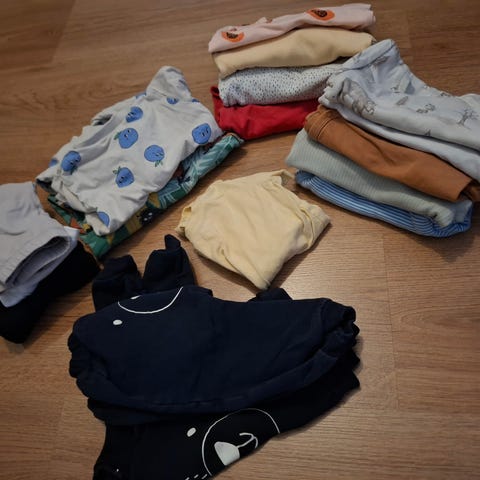 Vaatepaketti kokoa 68, ehkä enemmän kesäkäyttöön (meillä oli käytössä joulukuussa syntyneellä kesällä). Lähes kaikki taitaa olla Lindexiä. Kuvassa vasemmassa reunassa lyhythihaiset bodyt, sitten pitkähihaisia bodyja, muutamat housut ja shortsit sekä oikeassa reunassa unihaalarit. Osa paremmassa kunnossa ja osaa käytetty enemmän, kaikki kuitenkin on käyttökelpoisia vielä. Vain nouto Hämeenlinnasta.